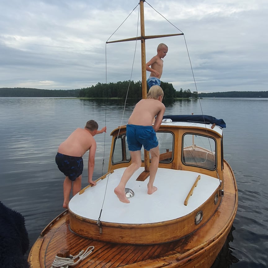På kvällen knökade vi ihop oss alla på svärföräldrarnas båt. Även Ebbe och Larzon var med så det var verkligen fullt. Barnen i vattnet kom upp de med sen och satt tillsammans med oss.